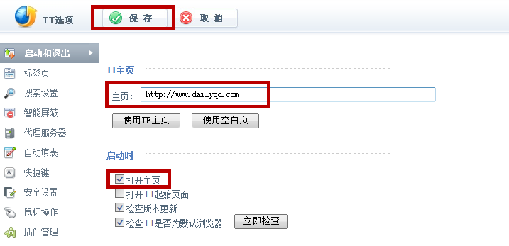 2.在"TT主頁"欄目下輸入"http://m.xiaofei2008.com/" 。 在"啟動時"欄目下勾選"打開主頁",點擊最上面一行"保存",設(shè)置成功。